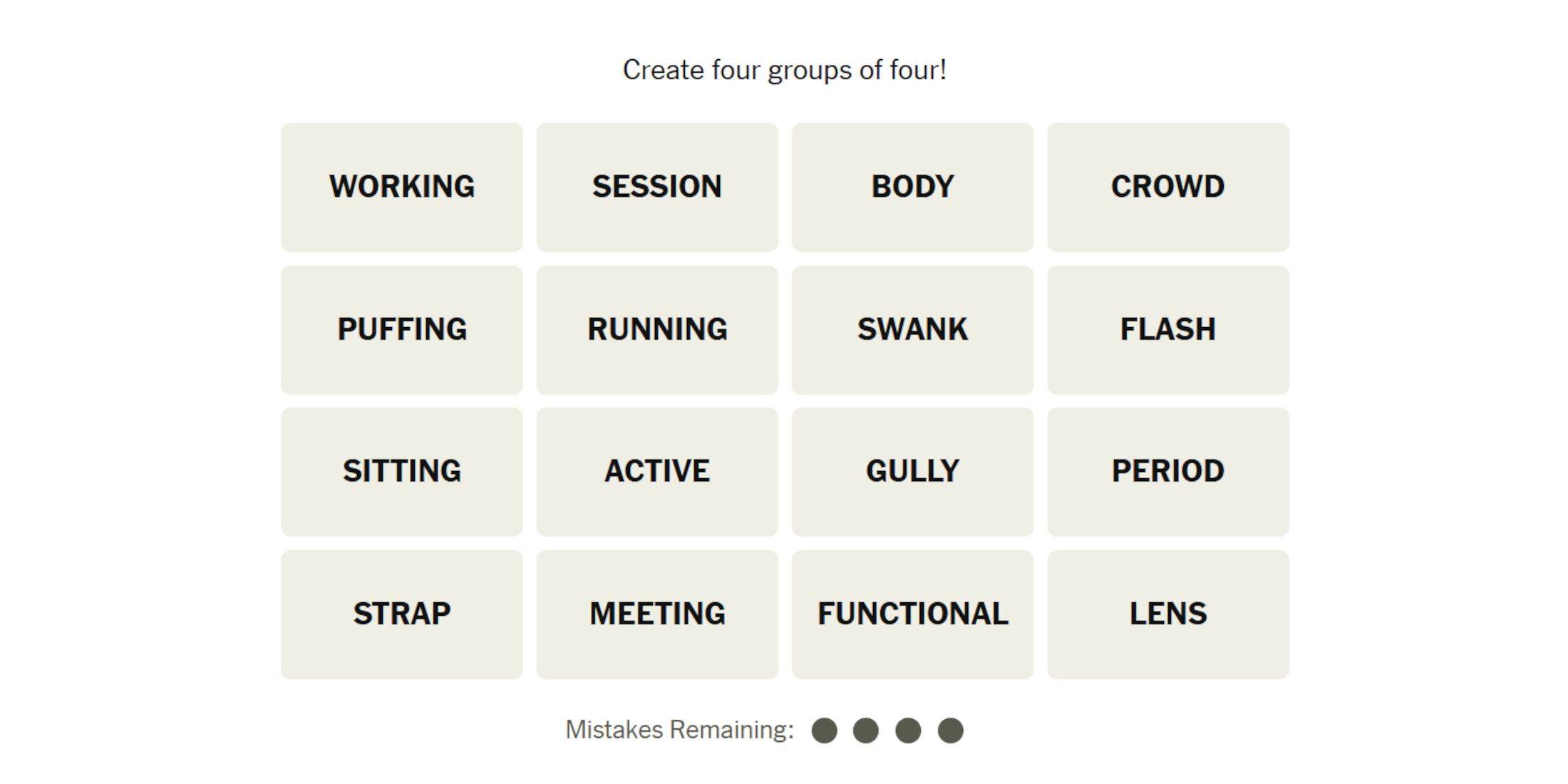 《关联词》游戏再次带来十六个单词,挑战你的分类能力。要取得成功,你需要仔细地将所有给定的单词归入其隐藏的类别,并尽可能减少错误。
